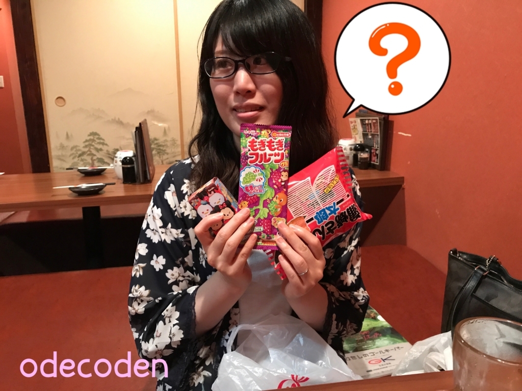 懐かしい駄菓子にほっこりしながらお酒を飲む私たち。